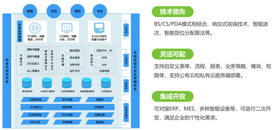 BS/CS/PDA模式相結(jié)合、響應式前端技術、智能波次、智能貨位分配算法等