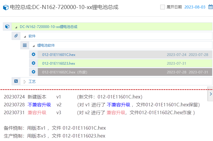 Mobox關于對數據版本的討論 2023/08/03 分類:產品中心 低代碼 實施方案 810 Mobox數據對象,是可以進行版本管控的,關于版本設置 兼容升級: 這個電控軟件 原先的版本被廢棄,直接采用當前新的版本 不兼容升級:這個新版本,只能在當前生產的電控總成里面用,以前的老的電控總成 是不能安裝到這個新電控軟件的;? 以前的電控總成將成為 備件燒制; 效果圖: 我們可以看到 v1 他是有時效性的,有效期到 20230728 標簽:低代碼方案 上一篇: Mobox低代碼(WMS)關于入庫作業流程的思考 下一篇: mogodb數據庫端口外網偵測不到