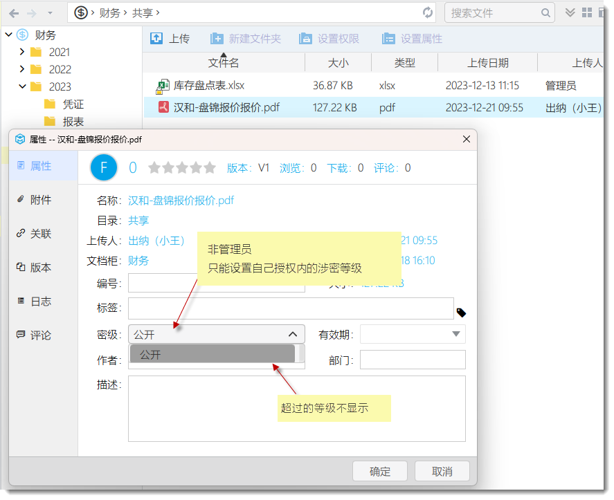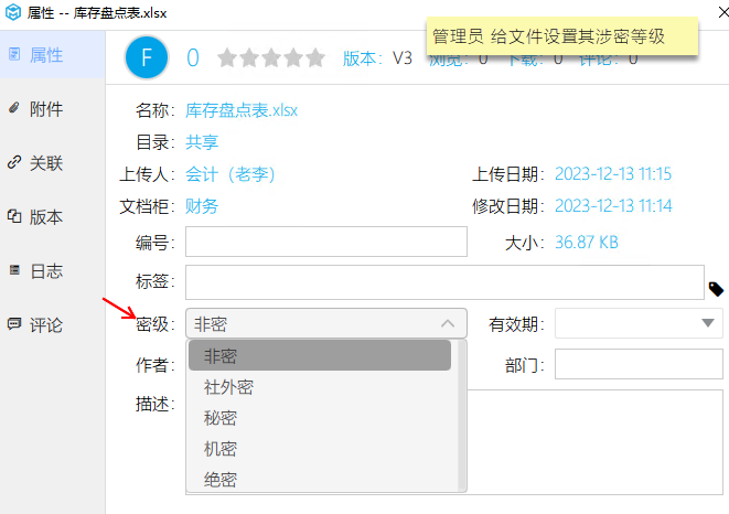 2、通過Mobox文件系統上傳的文件,管理員需要設置文件的涉密等級(所有等級)