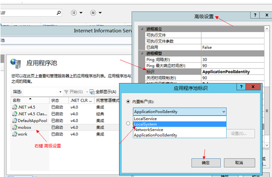 應用程序池=》設置應用程序池默認設置=>將標識:改為LocalSystem
