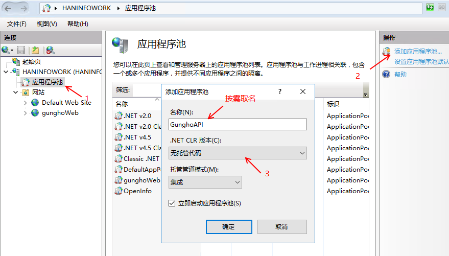 3、在 IIS 管理器中創(chuàng)建一個應用程序池,并將其設置為使用無托管代碼。