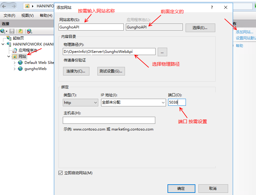 5、在 IIS 管理器中創(chuàng)建一個新的網(wǎng)站或將應用程序發(fā)布到現(xiàn)有的物理路徑。